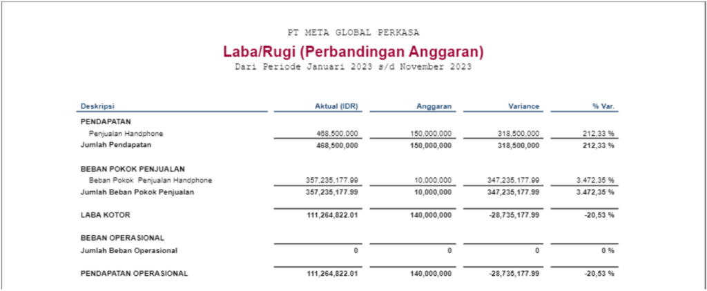 2. Contoh untuk laporan anggaran antara biaya actual dengan biaya anggaran adalah sebagai berikut. Perbandingan dapat diketahui setelah dilakukanya penjualan pada item yang sudah merujuk pada akun yang telah dibuatkan anggaran. Laporan ini menyajikan perbandingan nilai Aktual (tercapai) dengan nilai Anggaran (yang sebelumnya sudah dibuat) yang nantinya akan diketahui nilai selisih (Variance) untuk mengetahui berapa persen tercapainya suatu anggaran tersebut.